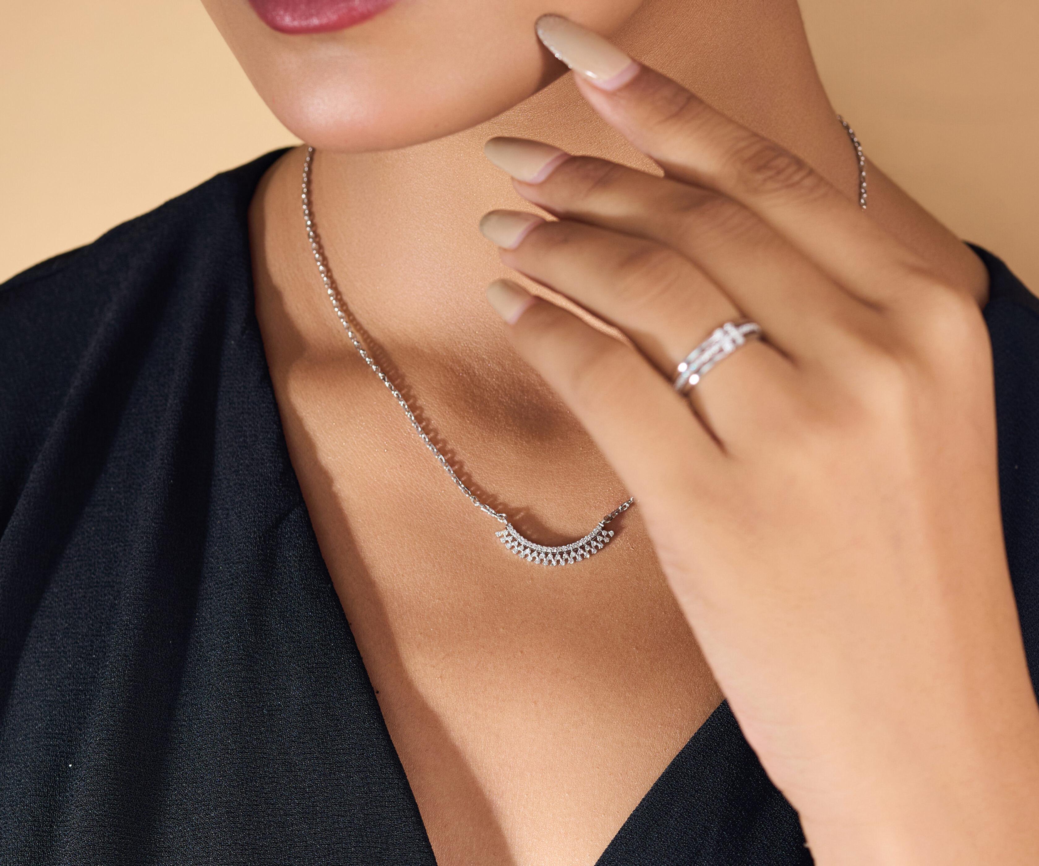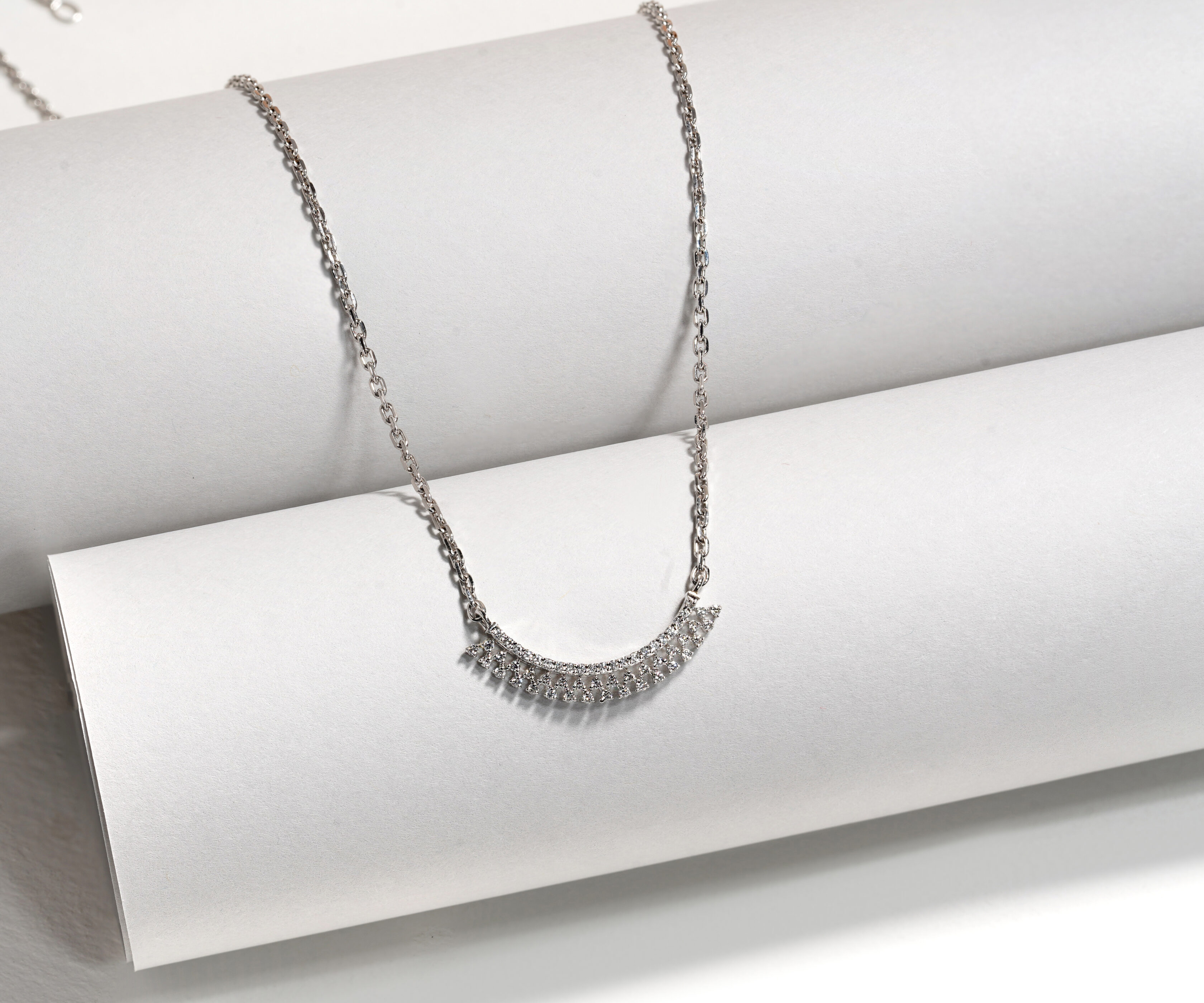 Illuminate your neckline with the effortless radiance of The Arc Of Light Pendant. This contemporary masterpiece features a sweeping, crescent-shaped bar that mirrors the natural contour of your collarbone. Adorned with a precision-aligned sequence of shimmering lab-grown diamonds, the design offers a fluid, “liquid-light” effect. With its sleek and understated silhouette, this “smile” pendant is the ultimate accessory for the modern minimalist, providing just the right amount of high-fashion sparkle for any hour of the d