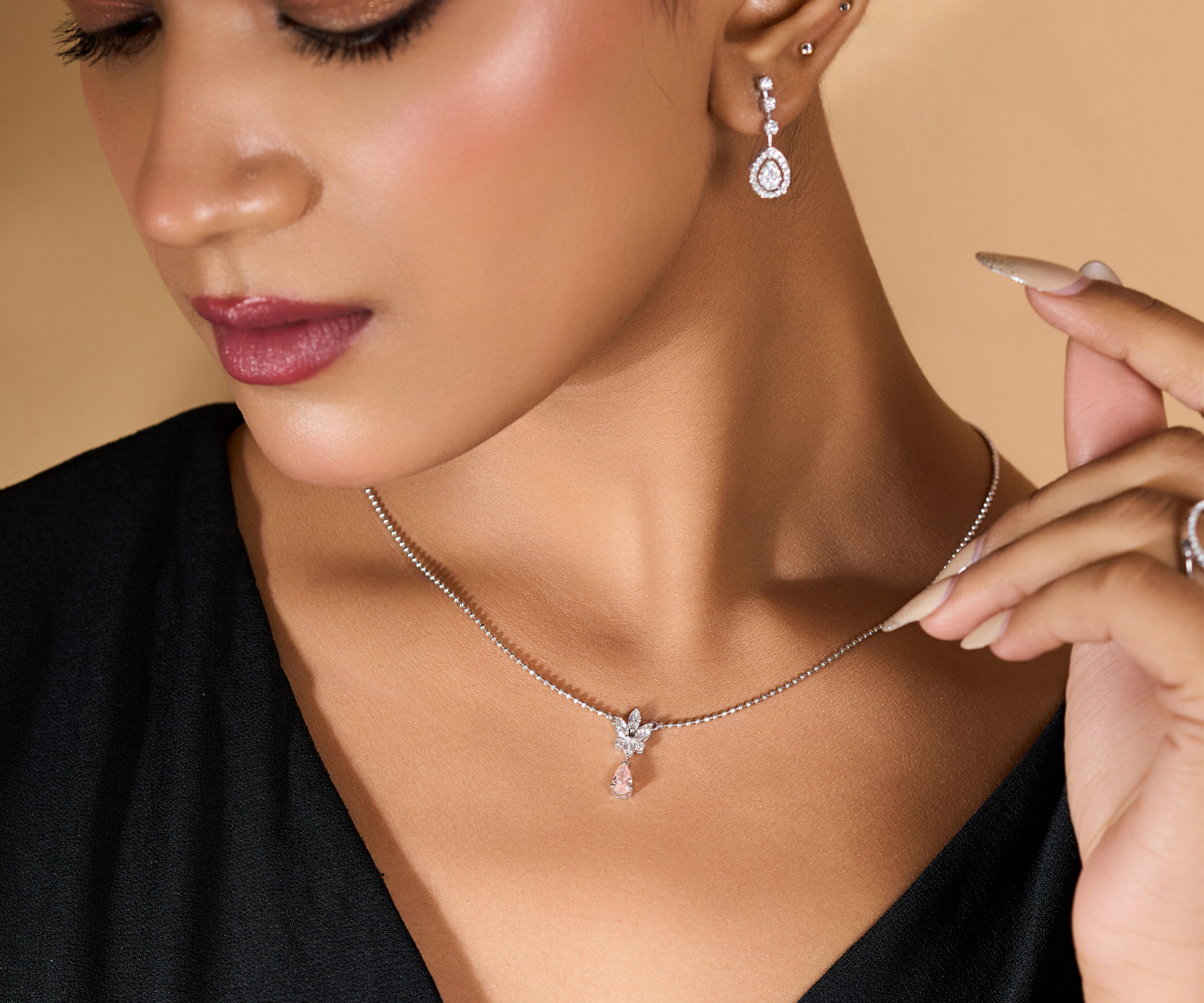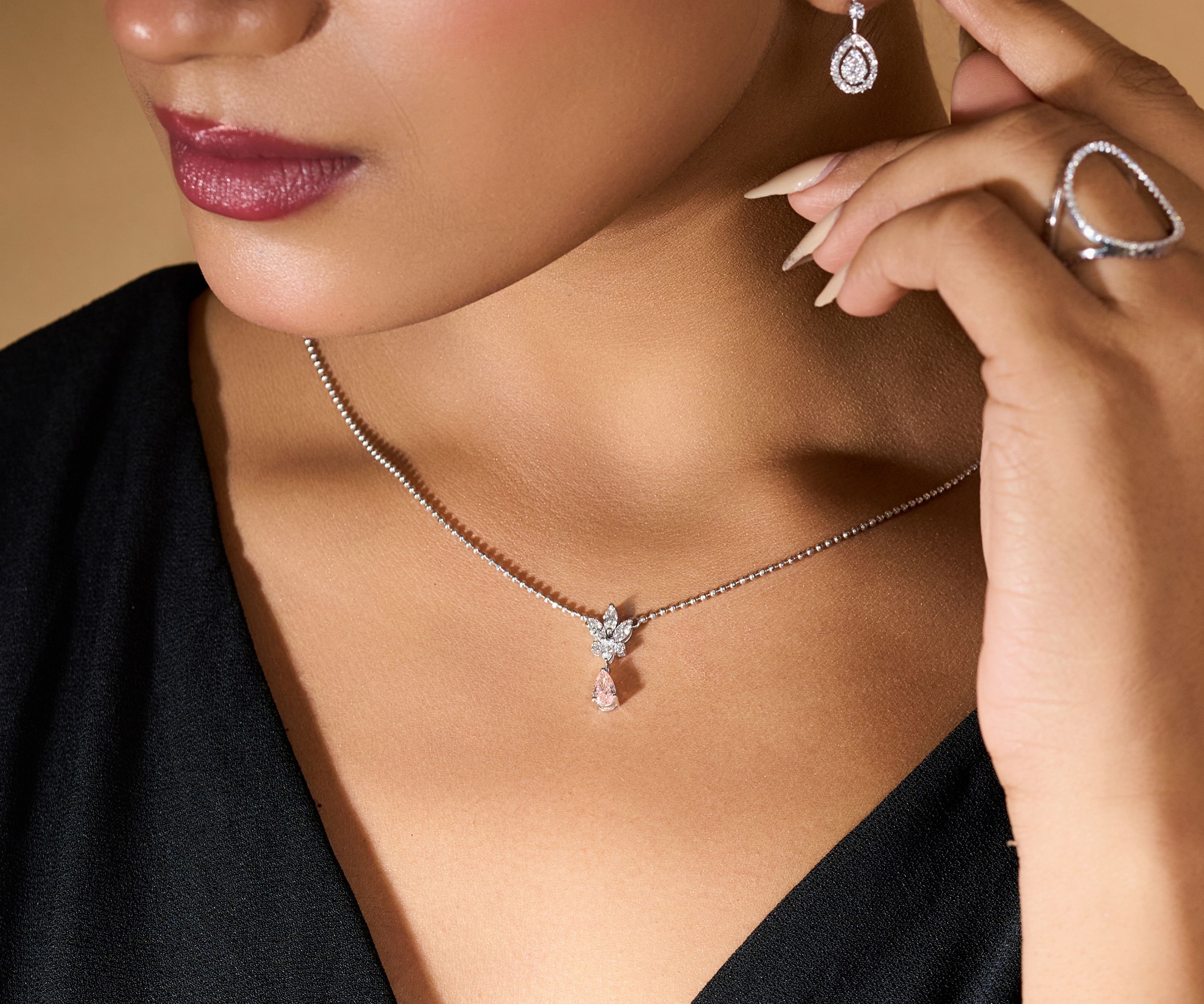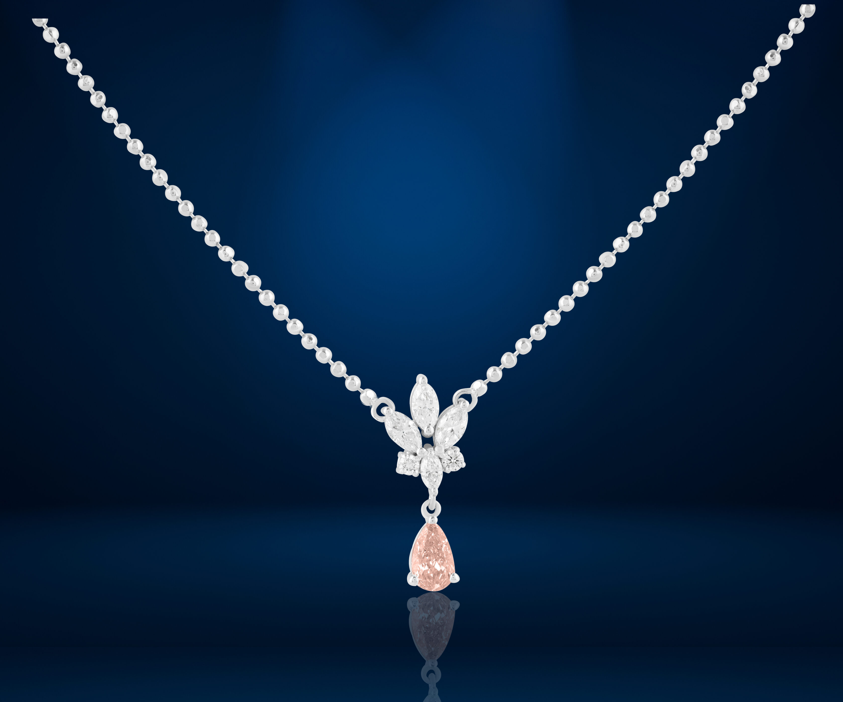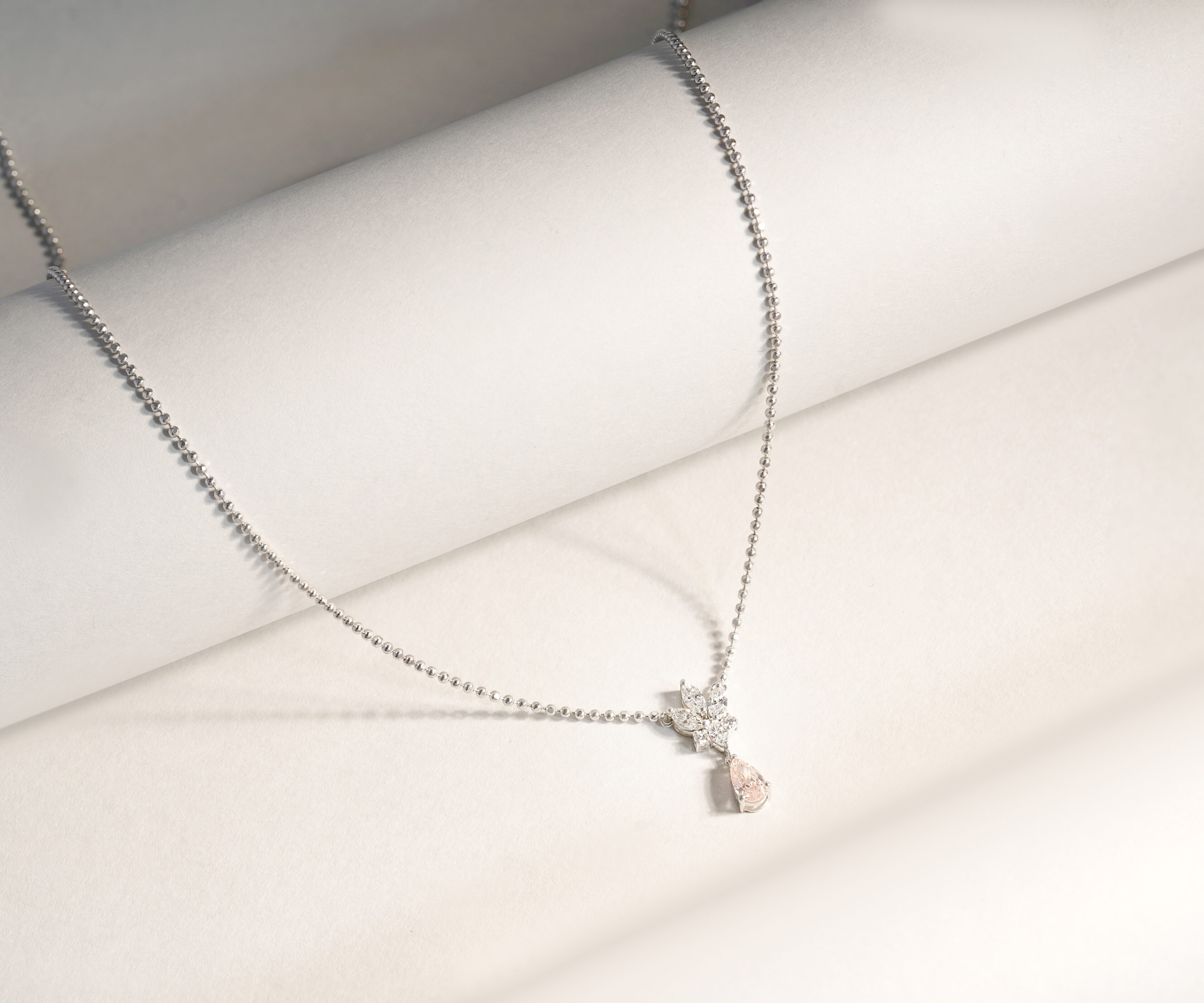 Step into a dream of soft light and organic beauty with the Bloom & Mist Pendant. This ethereal piece features a meticulously crafted diamond blossom that serves as a brilliant anchor for a suspended, peach-hued teardrop gemstone. The delicate contrast between the icy fire of the floral motif and the warm, misty glow of the central stone creates a poetic aesthetic. Designed for the woman who loves understated romance, this pendant brings a touch of nature’s serenity to your fine jewelry collection.