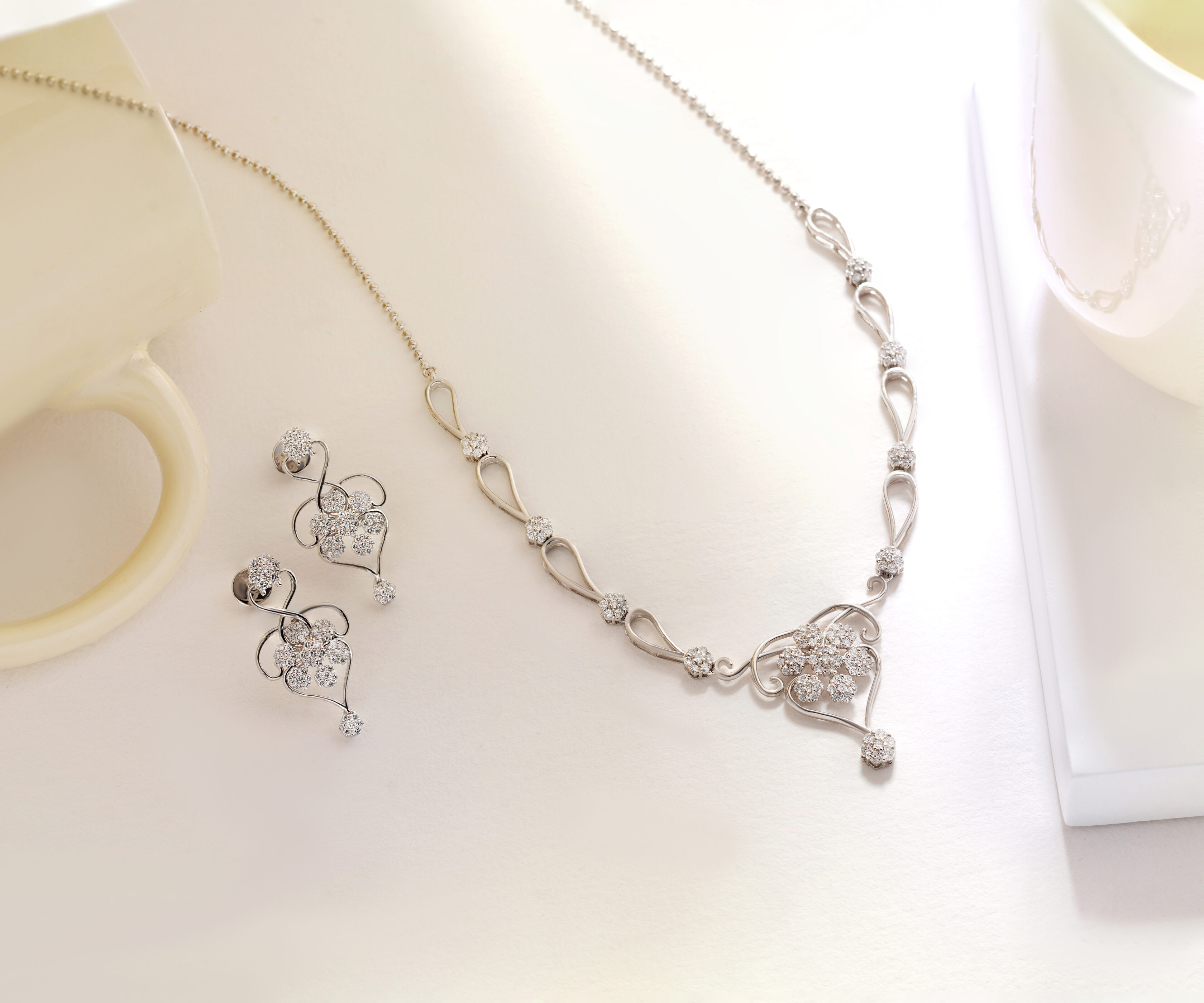 Step into a garden of light with The Floral Waltz Set, a masterpiece of romantic design and rhythmic artistry. This coordinated ensemble features a stunning necklace and matching drop earrings, both defined by an intricate sequence of diamond-encrusted flower clusters. The necklace is expertly crafted with sweeping, open-work “vine” links that lead to a magnificent floral centerpiece, while the earrings mirror this graceful motion with delicate, petal-inspired curves. Inspired by the natural movement of a blooming garden, this set offers a poetic and airy aesthetic perfect for the woman who values classic femininity with a modern touch.