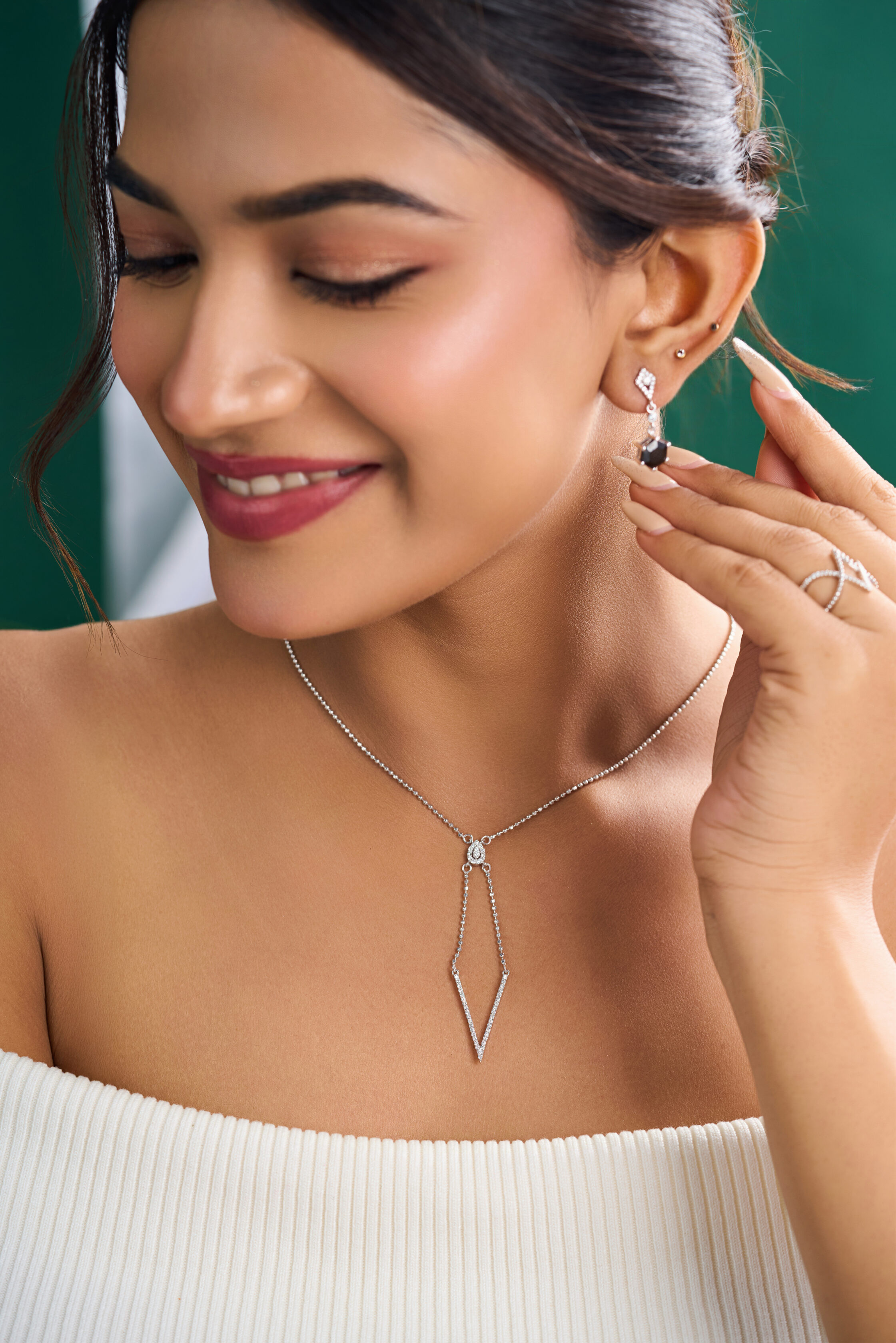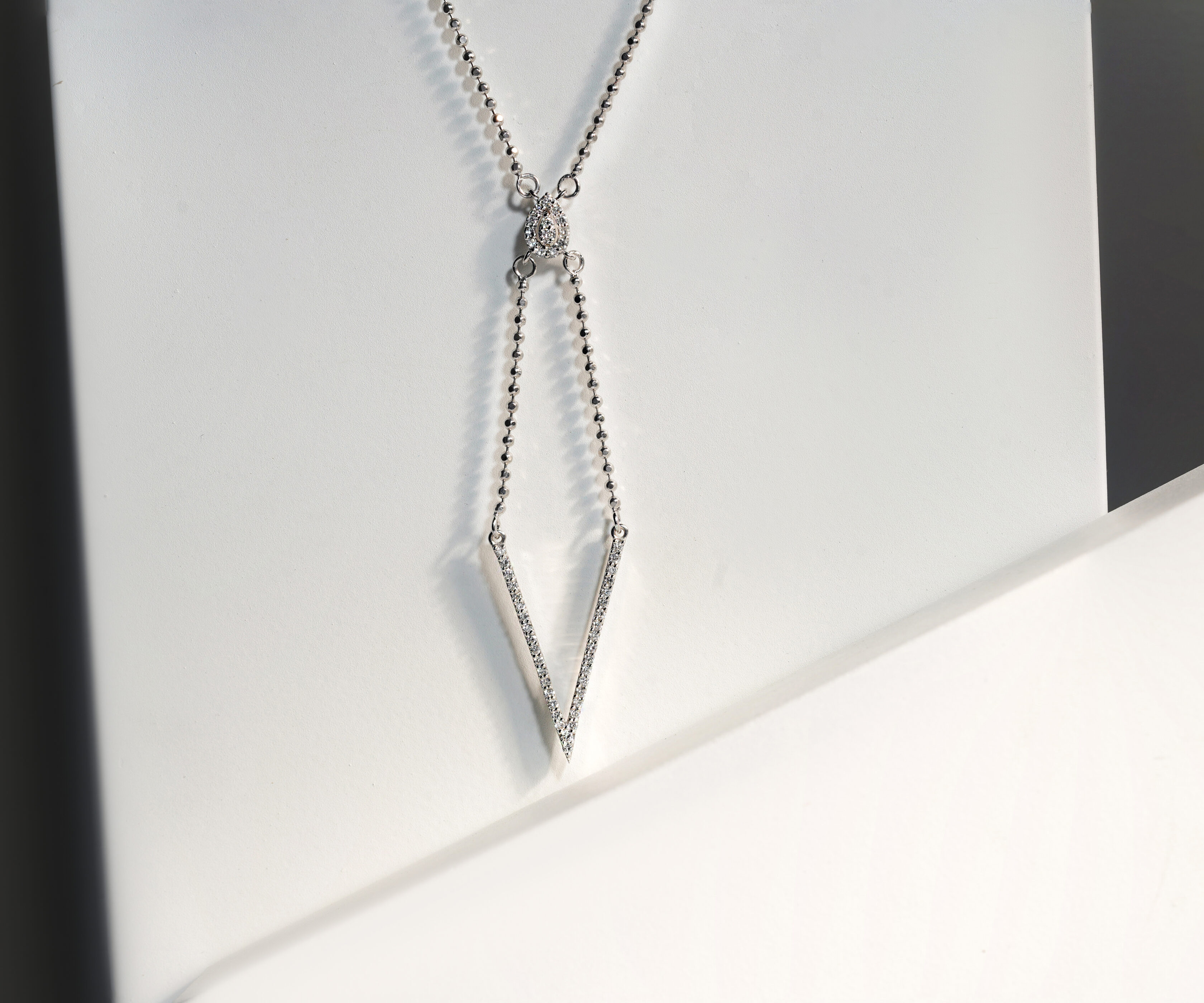 Make a daring entrance with The Geometric V Pendant, a masterclass in modern structural design. This avant-garde piece features a sharp, elongated chevron frame, meticulously hand-set with a shimmering path of diamonds. Suspended from a delicate, micro-beaded chain by a refined teardrop anchor, the silhouette creates a powerful vertical line that is both lengthening and high-fashion. Perfect for the woman who gravitates toward “Industrial-Chic” luxury, this pendant transforms a classic motif into a bold, contemporary statement.