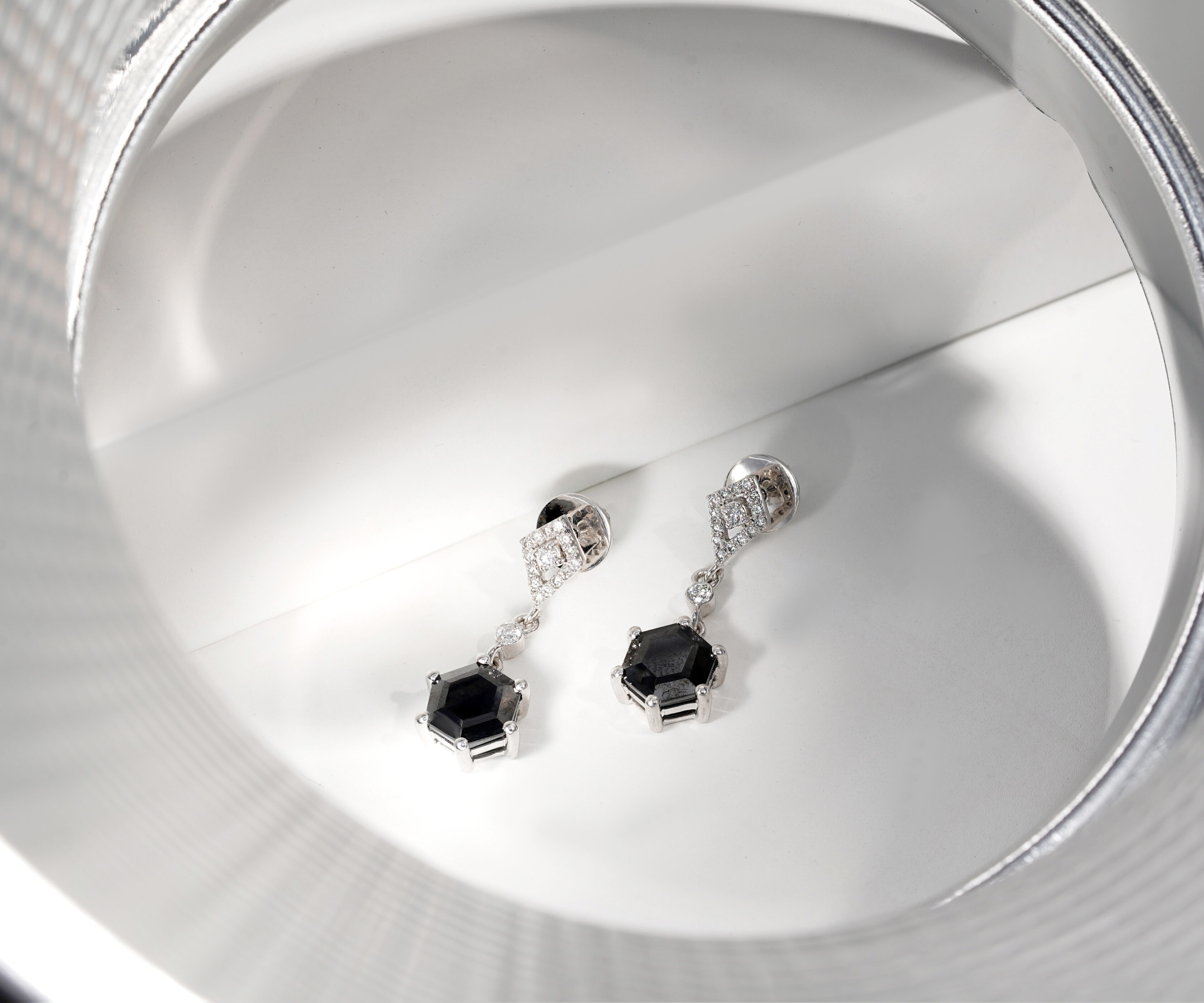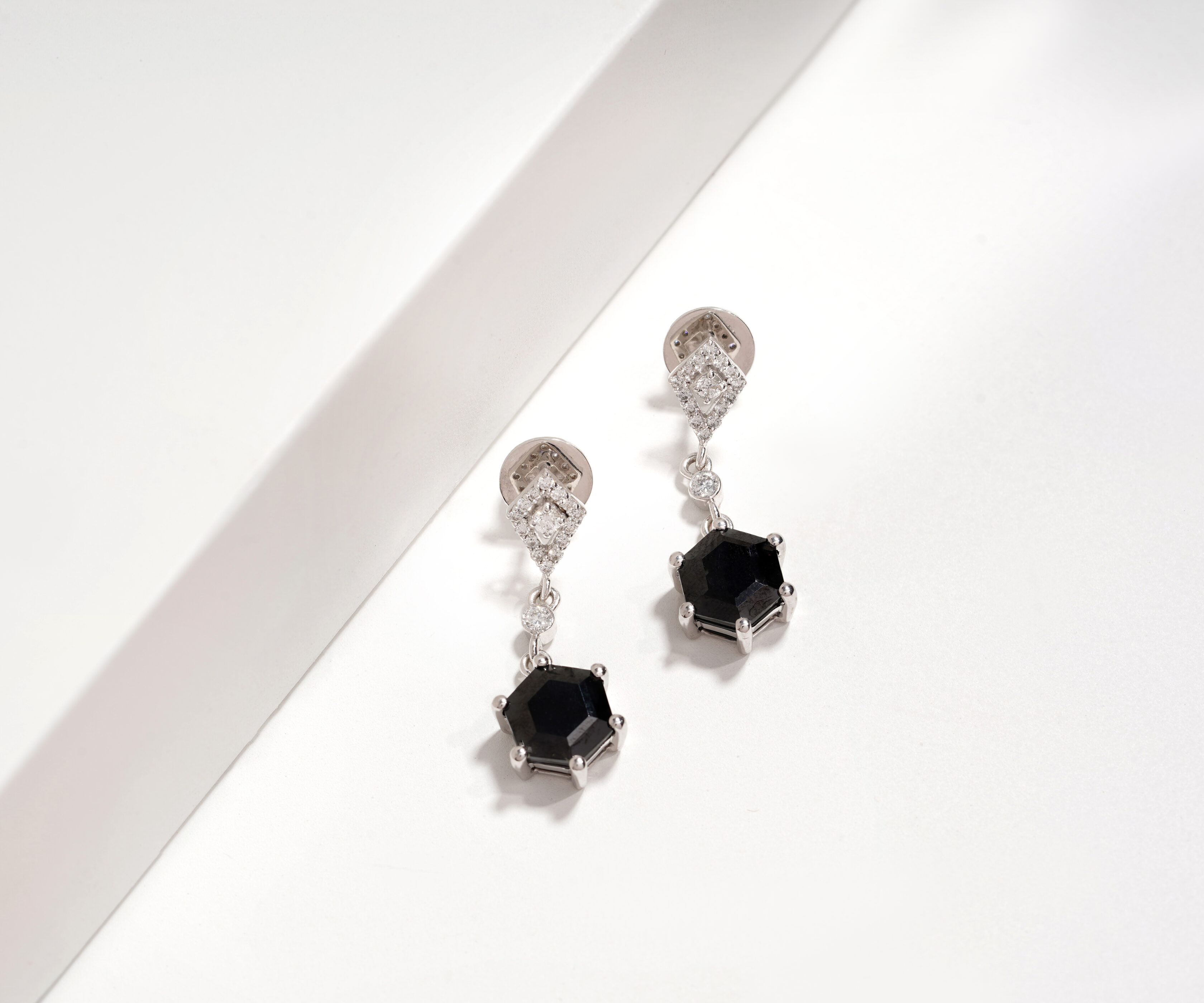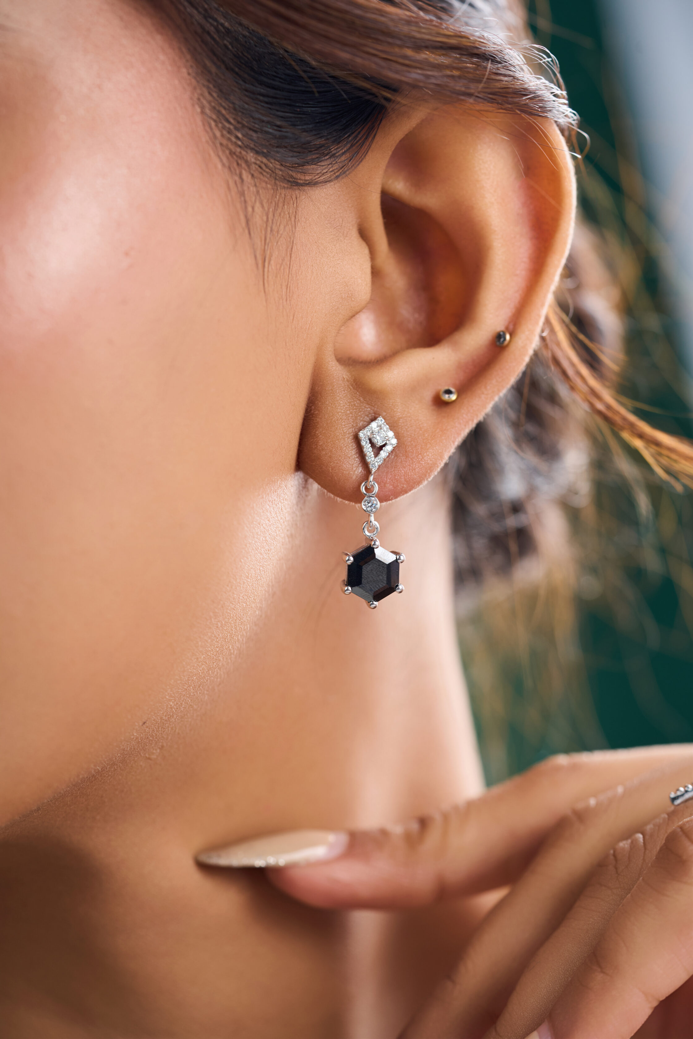 Make a sophisticated statement with The Midnight Hexagon Earrings, a daring exploration of contrast and geometry. These striking drops feature a bold, deep-black hexagonal centerpiece that anchors the design with mysterious allure. Suspended from an intricate, diamond-encrusted kite motif, the monochromatic palette creates a rhythmic interplay between shadow and light. Perfectly capturing a modern Art Deco aesthetic, these earrings are designed for the woman who values sharp, architectural silhouettes and a high-drama finish.