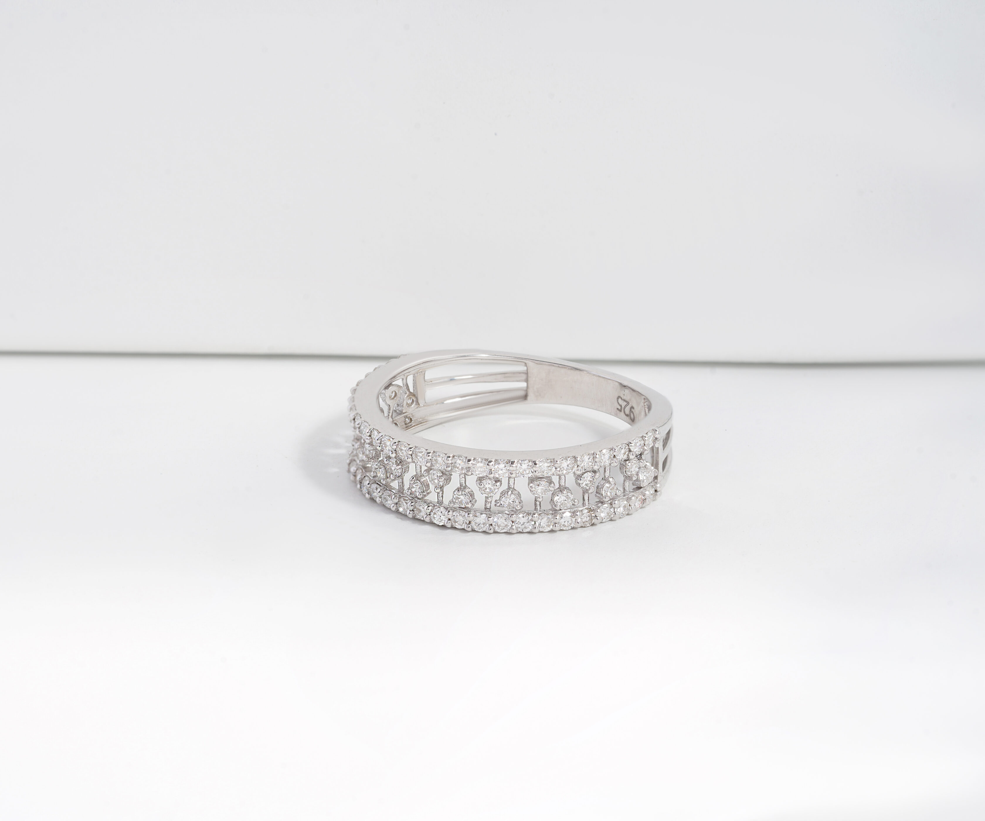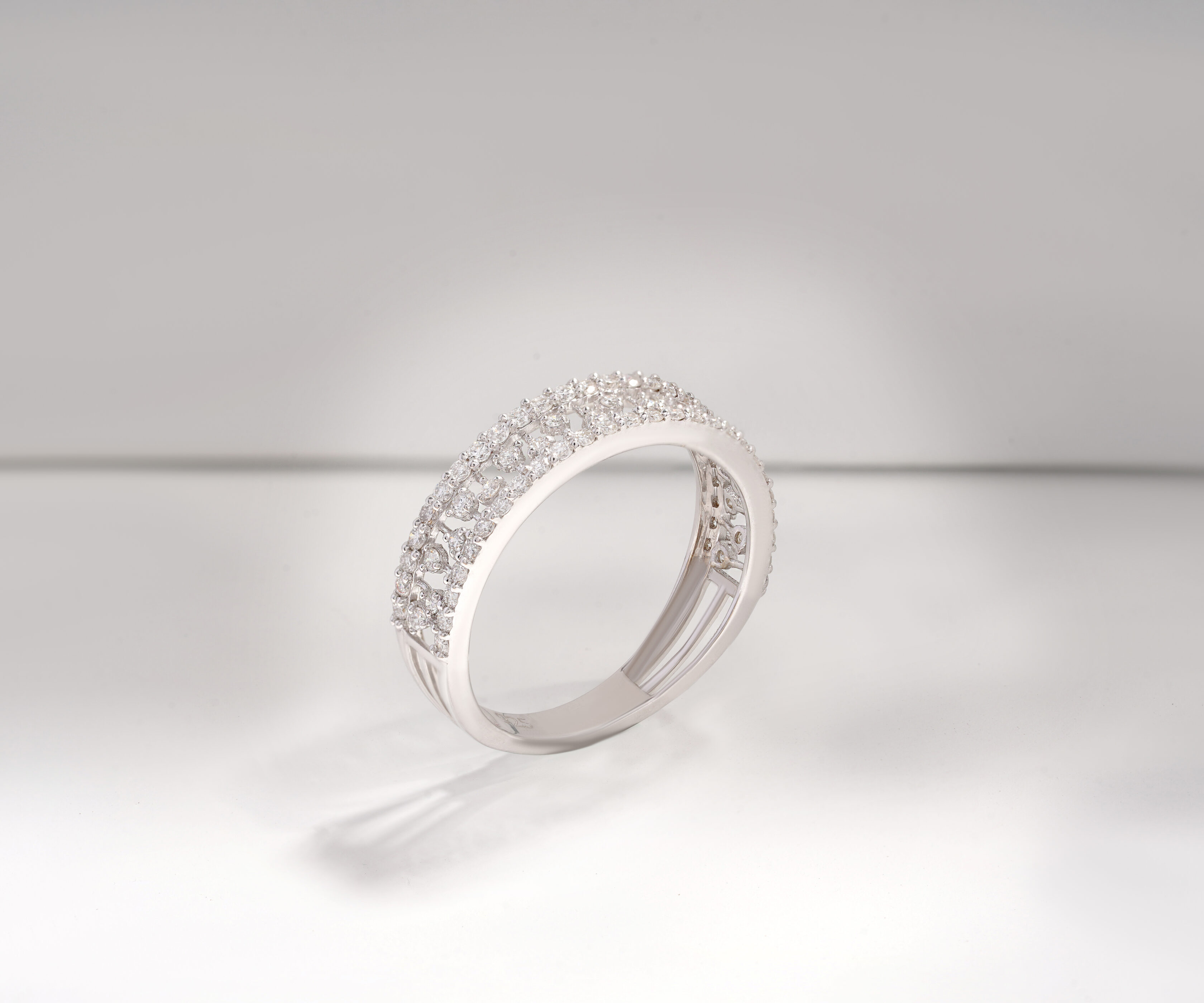 Bridge the gap between timeless grace and modern structural design with The Radiant Bridge Ring. This sophisticated wide-set band is a masterclass in architectural jewelry, featuring two parallel borders of shimmering pavé diamonds. Connecting these outer rows is an intricate open-work lattice, composed of delicate vertical “beams” of light that create a rhythmic, three-dimensional silhouette. Perfect for the woman who seeks a bold statement piece, this ring offers a substantial presence on the finger while maintaining an airy, weightless aesthetic.